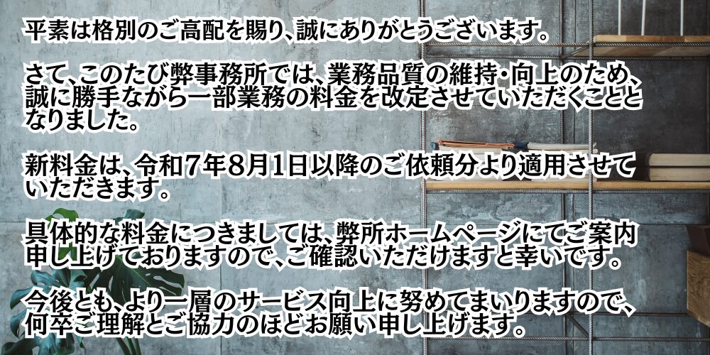 ☑料金には、消費税法及び地方税法の規定により行政書士の役務の提供に対する対価に課される消費税及び地方消費税の額を含みます。なお、消費税10%にて計算しており税率が増減した場合、改正税法施行日以降における増減後の税率を適用させて頂きます。